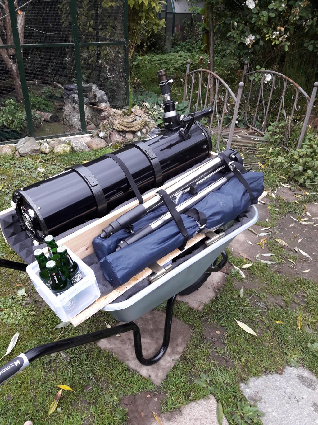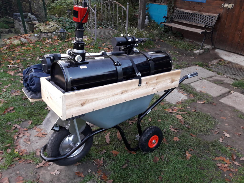 Um das ganze Gerödel nicht ständig auf die umliegenden Felder schleppen zu müssen, habe ich mir ein "Astro-Cart" gebastelt: Eine Schubkarre mit (Gummi-gedämpfter und gepolsterter) Teleskopaufnahme und Ablagefläche für Stativ und zwei Klappstühle. Die Stativ-Ablage lässt sich aufklappen und im Bauch der Transportkarre gibt es - ebenfalls gepolstert - reichlich Stauraum für Montierung, Gegengewichte, Laptop, DSLR, Objektive, Okulare, Filter, usw. Ein Bierhalter darf natürlich nicht fehlen: