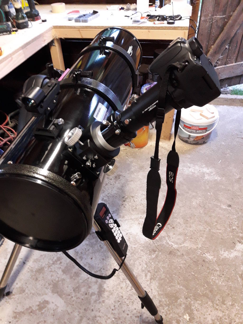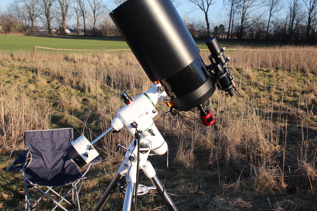 Den Tubus habe ich zunächst auf die Montierung des Orion N 150/750 StarSeeker IV gesetzt. Da der aber deutlich schwerer ist, ist der Motor der Montierung damit schon ziemlich am Limit.