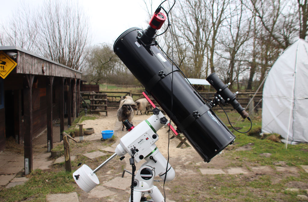 Mittlerweile habe ich meine Montierung durch eine kräftigere Skywatcher EQ6Pro ersetzt, diese hat einfach mehr Nutzlast. Hier mit dem 8" Newton und unseren neugierigen Schafen im Hintergrund: