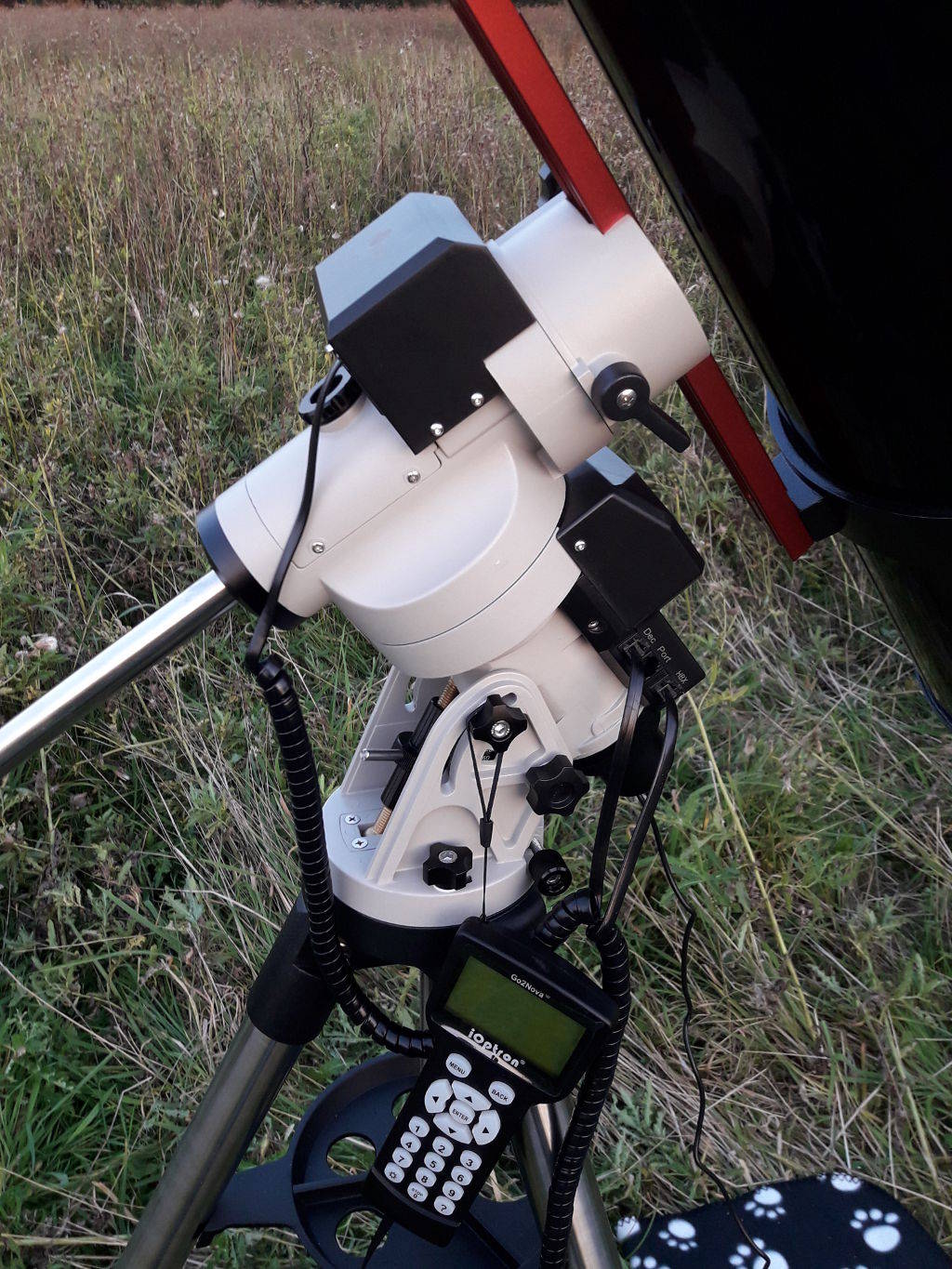 Ich habe die Montierung zunächst grob nach Anleitung eingenordet. Um ein genaues "Goto" (also die Anfahrt zu einem Objekt) auf Knopfdruck zu ermöglichen, muß die Montierung auf den Polarstern ausgerichtet sein. Hierzu hat das Gerät einen Polsucher. In die Thematik muß ich mich allerdings noch ein wenig "eingrooven", für ein Plantentracking reicht unsere bisherige Einrichtung aber schonmal.
