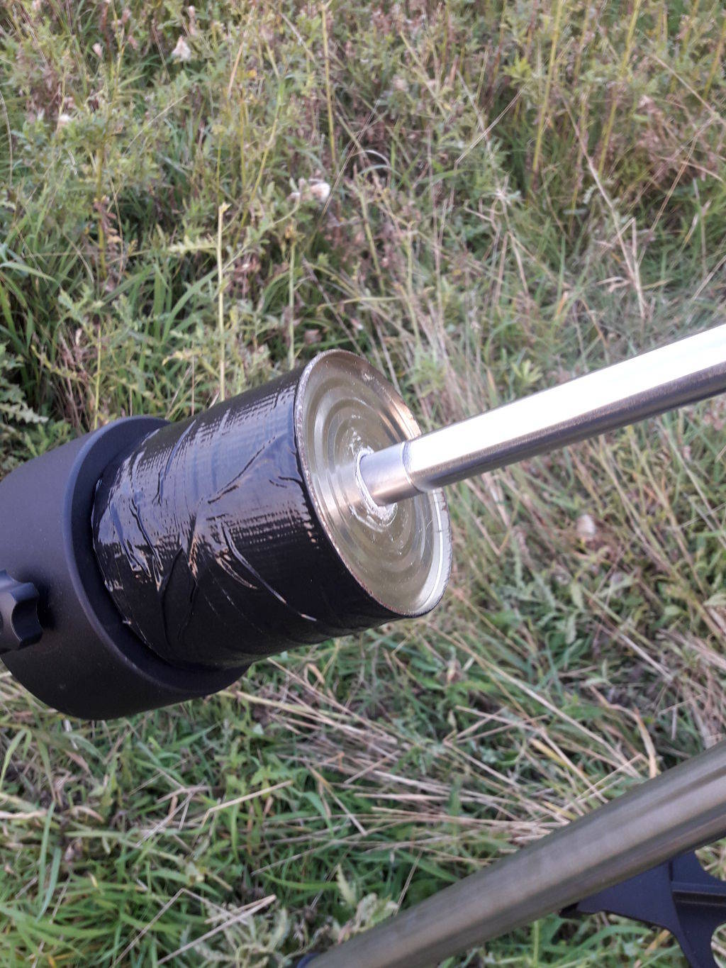 Bei dieser Art Montierung wird das Gewicht des Telekops immer durch ein Gegengewicht ausbalanciert. Beim ersten Aufbau stellte sich heraus, dass der Tubus unseres Newton zu schwer für das mitgelieferte Gegengewicht war. Weil wir nicht auf die Lieferung eines weiteren Gewichtes warten wollten, haben wir uns folgende "Mac Gyver"-Lösung einfallen lassen: wir haben eine Konservendose aufgeschnitten, einen Schlauch in der Mitte zentriert und das ganze mit Schnellzement gefüllt. Fertig ist das Gegengewicht - funktioniert bestens: