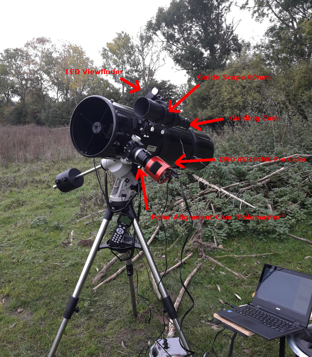 Wie Ihr am mittleren Bild erkennt, habe ich jetzt auch die Kameraseite aufgerüstet. Ich habe mir eine ZWO ASI294MC Pro Color - Astrokamera angeschafft. Die Kamera hat einen sehr rauscharmen Chip und verfügt über eine aktive Kühlung um diesen auf eine konstante Temperatur herunterzukühlen. Hiermit sollten mir auch erste Deep-Sky-Aufnahmen gelingen.
