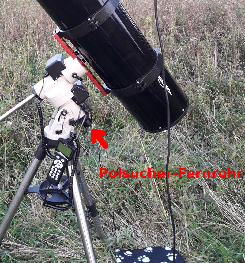 Um ehrlich zu sein - das ist alles ein ziemlicher Krampf - gerade für Anfänger wie mich. Man muß die Positon des Polarsternes ablesen, sich dann vor das Teleskop knien und aufwärts durch das Polsucher Fernrohr gucken:
