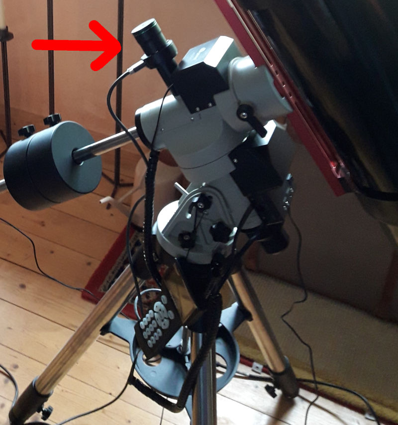 Die PoleMaster-Kamera wird mit dem Laptop verbunden, das Teleskop befindet sich in der oben beschriebenen Stop-Position, die Kamera zeigt also schonmal nach Norden.