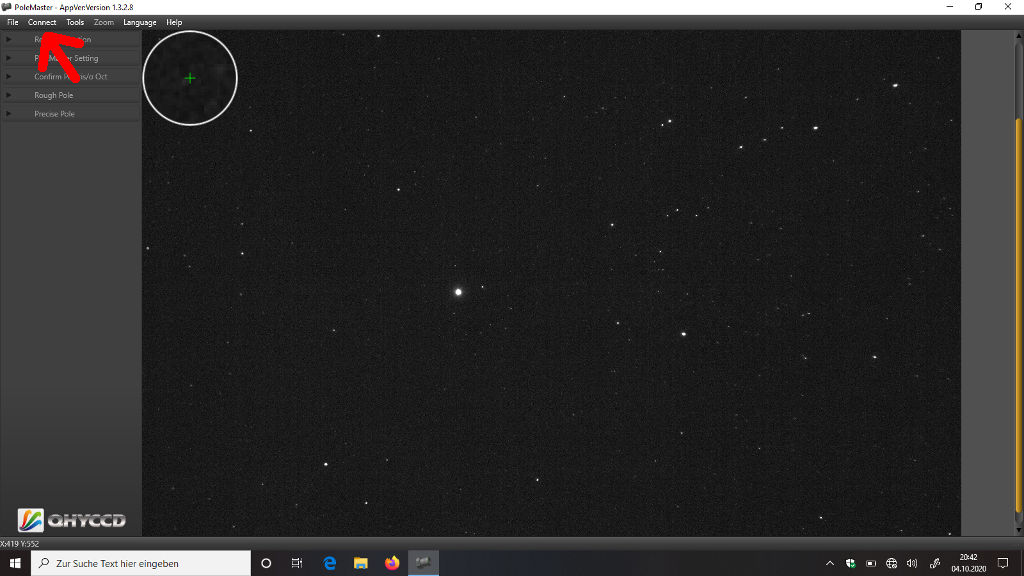 Nach Start der Software klickt Ihr auf "Connect" und solltet dann schonmal den Sternenhimmel sehen. Der hellste Stern ist in der Regel schon Polaris. Sollte dieser nicht ganz in der Mitte stehen, dann ist Euer Stativ vermutlich zu ungenau in Richtung Norden ausgerichtet. Ihr könnt es vorsichtig ein wenig verrücken, es muß danach aber wieder exakt und laut Wasserwaage gerade gestellt werden. Es kommt nicht darauf an, dass Polaris exakt in der Mitte steht, er sollte nur nicht zu weit am Rand liegen..