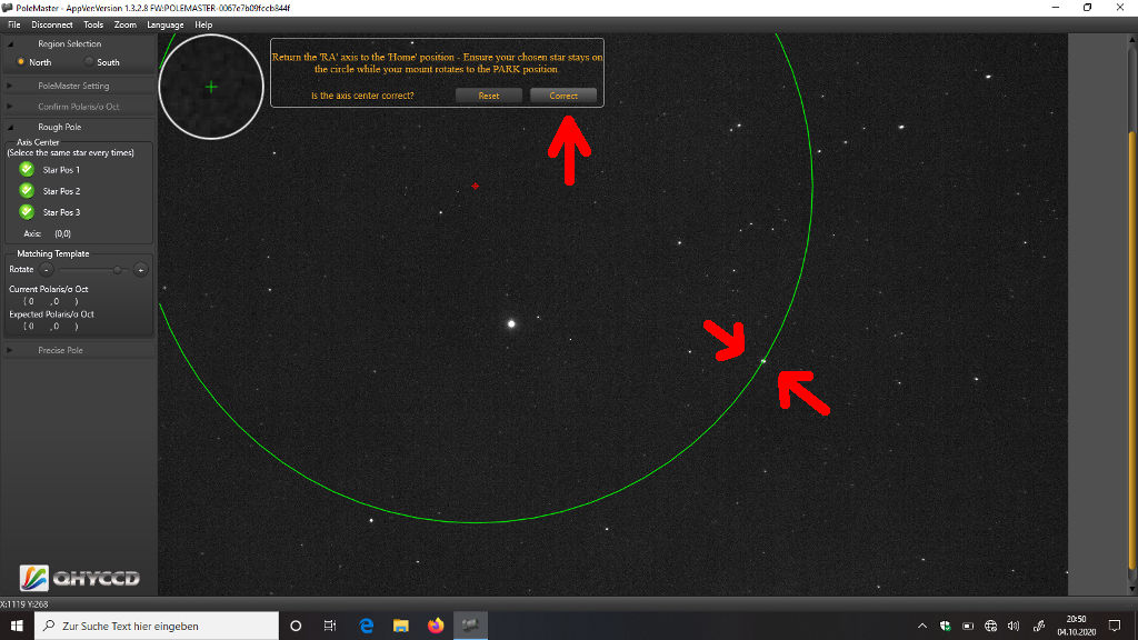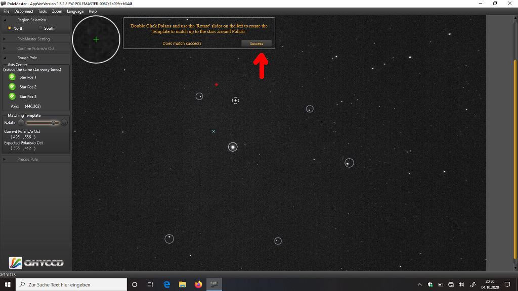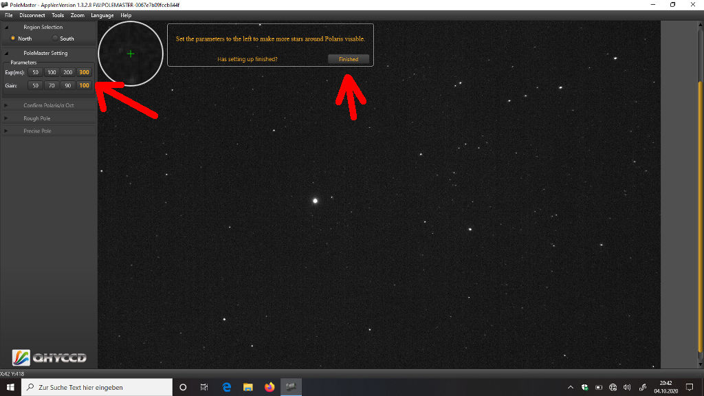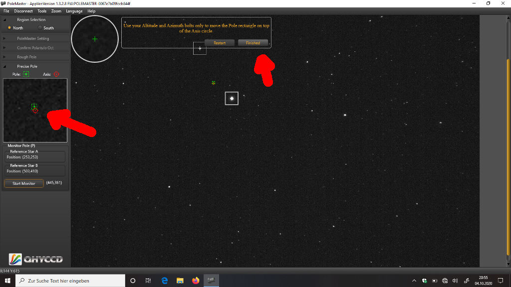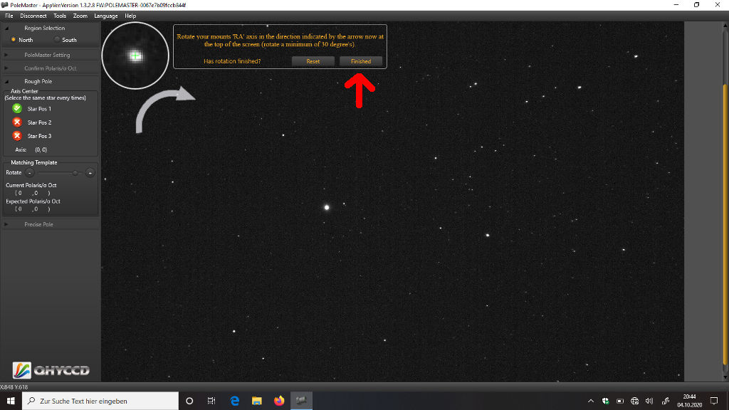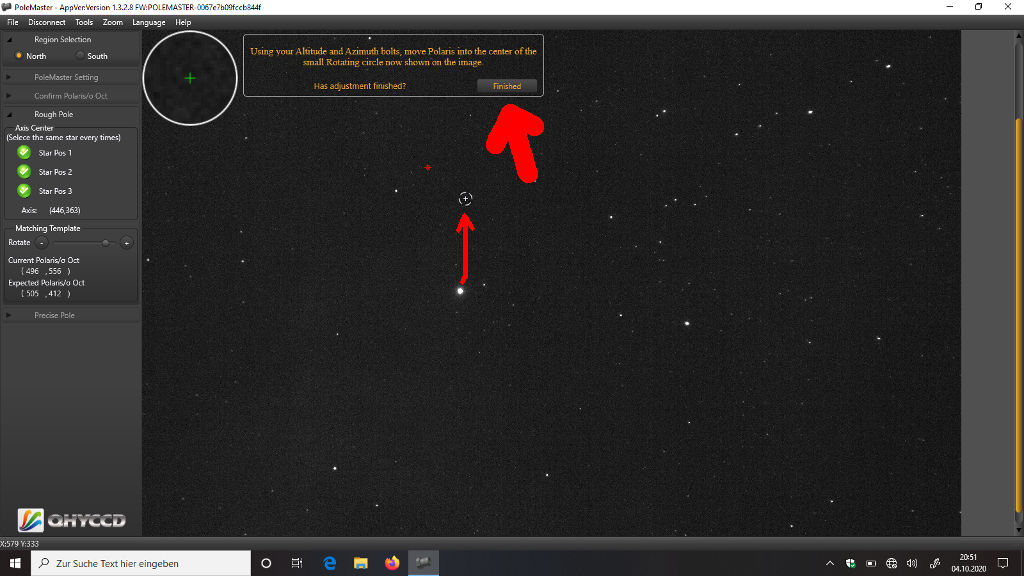 Das erfordert ein bisschen Fingerspitzengefühl, aber die Übung macht den Meister. Ist Polaris im Kreis, klickt Ihr "Finished":