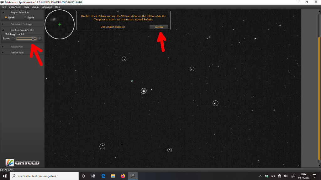 Jetzt sehr Ihr einen kleinen rotierenden Kreis auf dem Bildschirm. Mit den Höhen- und Azimuthschrauben bewegt Ihr Eure Montierung jetzt so, dass der Polarstern in diesem Kreis landet.