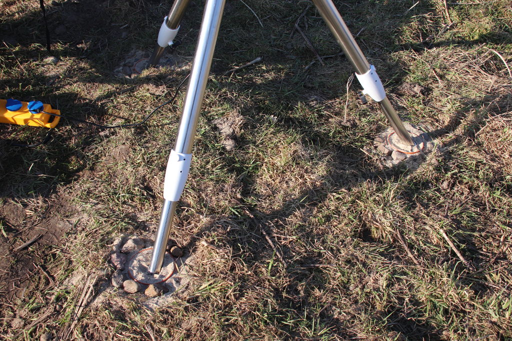 Die Einnordung mache ich mit dem PoleMaster (siehe Polar Alignment), das erleichert schon einiges und doch dauert es immer eine Weile. Um das Einrichten der Montierung zu vereinfachen, habe ich mir den Standort der letzten Einnordung markiert indem ich drei DN-125 Doppelmuffen (aus dem Sanitärbedarf) eingegraben und mit Sand befüllt habe. Die Stativbeine der Montierung stehen etwa in der Mitte dieser Muffen. So ist der Polarstern schonmal grob im Sichtfeld und das Einrichten geht sehr viel schneller.
